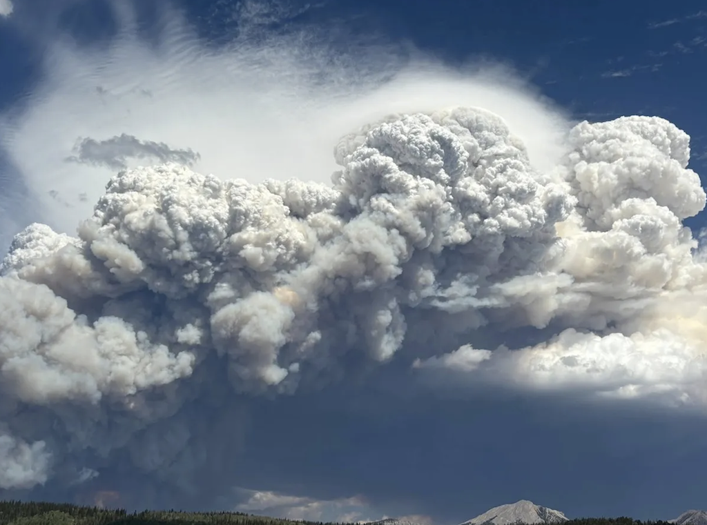 The towering smoke column from the Dollar Lake Fire as seen early in the forest fire’s development. (Kendell Valley Lodge) Via WyoFile.com
