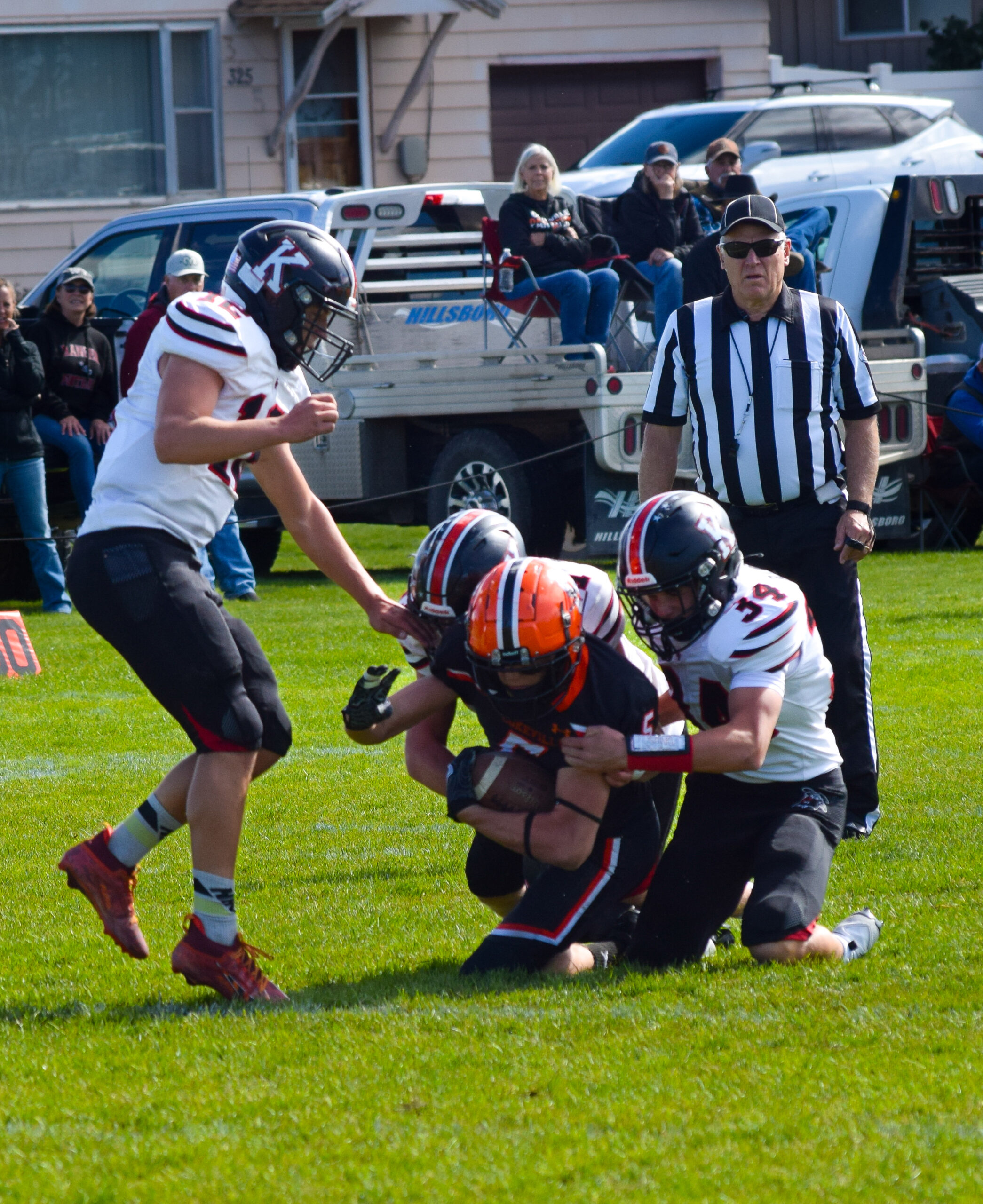 Dawson Crosland (#34) is part of the Ranger response as they make a tackle against the Panthers. (PHOTO BY CHRISTY BROOKS, VIEW THROUGH LENS FACEBOOK PAGE)