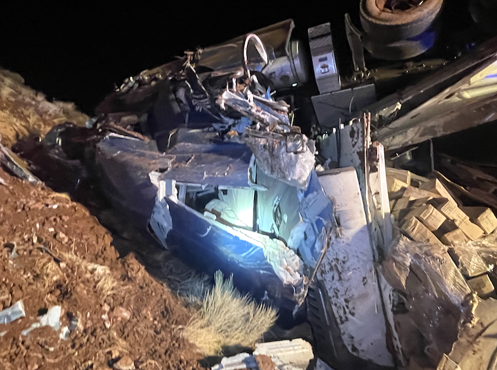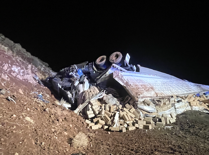 According to information provided by the Wyoming Highway Patrol (WHP), the incident took place at approximately 6:15 p.m. Two semi-trucks were headed eastbound when a third semi-truck, headed westbound, drifted across the center line where it sideswiped the lead semi from the opposite direction. The momentum then took the westbound truck into the second trailing semi and forced it across the road where it overturned. The trailer then broke apart and spilled its cargo.