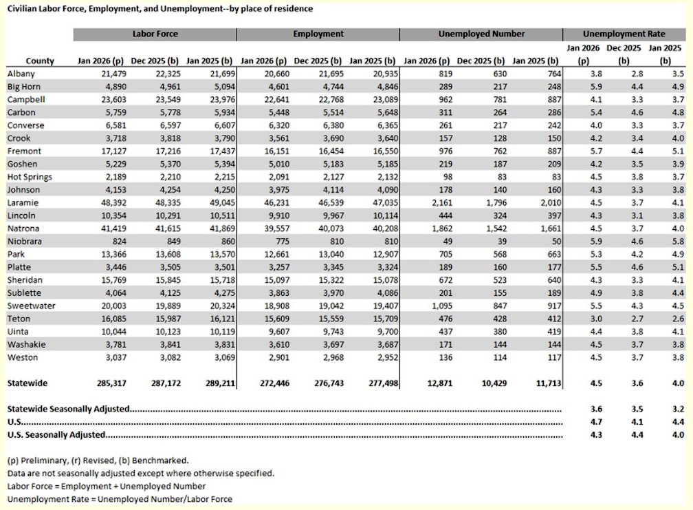 Wyoming’s unemployment rate was higher than its year-earlier level of 3.2%, but considerably lower than the January 2026 U.S. unemployment rate of 4.3%, the DWS reported Thursday.